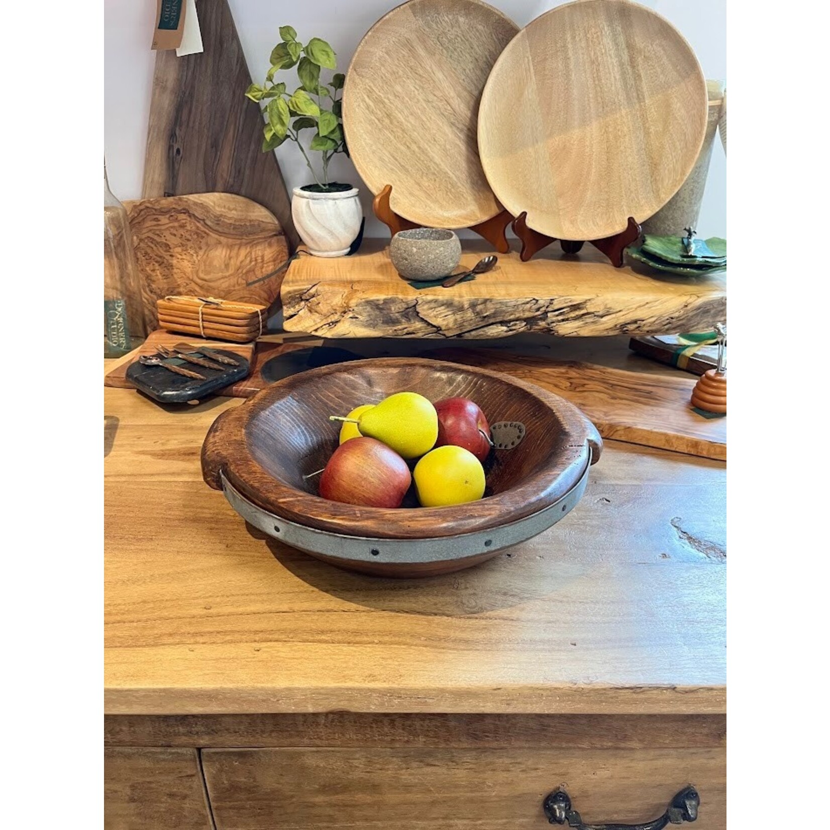 Made from pine timbers salvaged from 19th century European structures this ruggedly handsome bowl is infused with the Old World craftsmanship and antique appeal of its materials. Hand finished and accented with galvanized metal bands this inviting vessel makes an attractive centerpiece that lends a dash of historic panache to your kitchen dining table or sideboard. Handmade by artisans in Hungary. Essential Details: Handmade Recycled item. Made from reclaimed wood salvaged galvanized metal Measurements approximately 3" H x 13" diameter Notes: Hand wash
