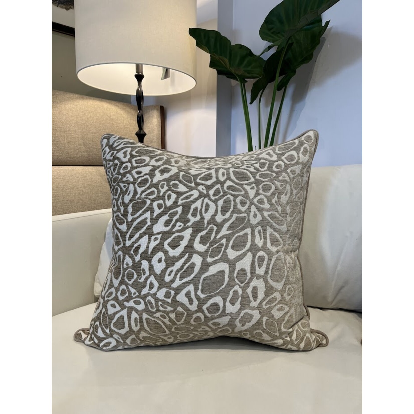 Expertly tailored with a breezy natural back and welt, this 24x24 pillow comes with a luxurious down-feel insert wrapped in a water-repellent cover for added comfort and longevity. Made in the USA, it’s a statement piece that blends effortless elegance with everyday practicality.