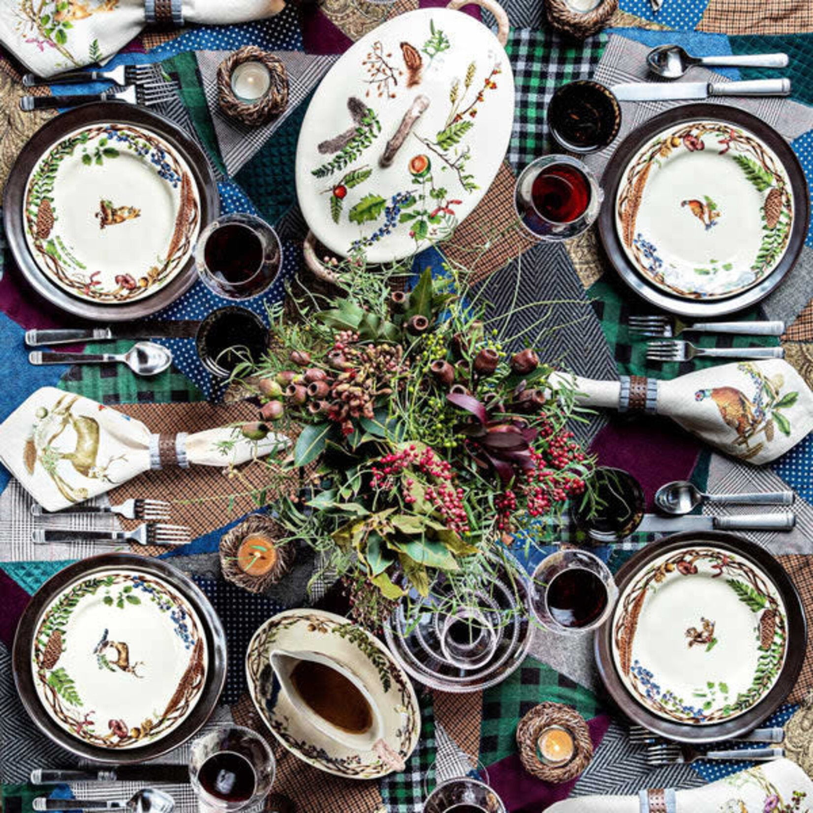 Celebrating the bounty of friends and abundant fare at harvest time, we’ve invited four new guests to our Autumn table! Upon a set of four dessert/salad plates from our cherished Forest Walk collection, a stately stag, regal pheasant, thoughtful fox, and charming squirrel are featured within the confines of our painterly Fall border.