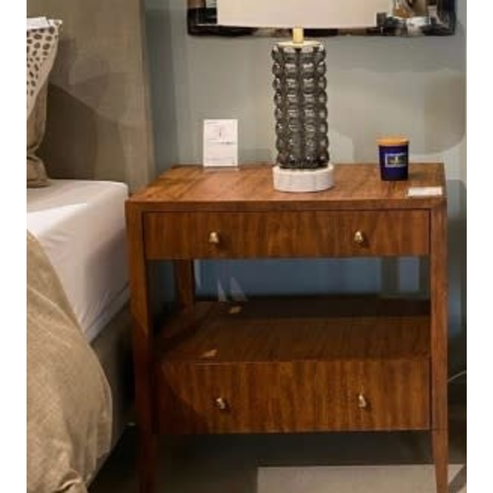 A stylish and functional two-drawer nightstand with abstract brass knobs and a rustic natural Brazilian wood finish, this nightstand is a perfect addition to your bedroom.