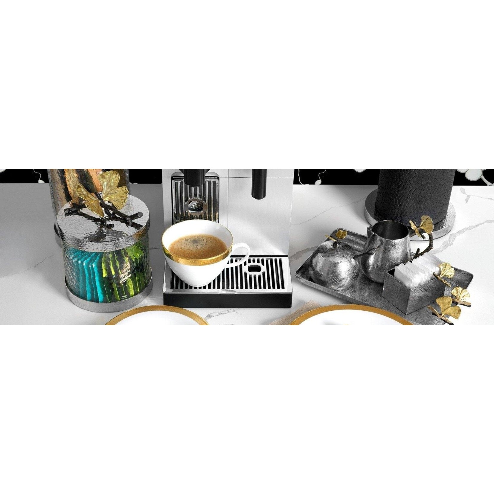 Michael's fascination with a particular type of ginkgo tree , the Ginkgo Biloba, or "Butterfly Ginkgo", which grows with a double leaf reminiscent of a butterfly's wings, gave rise to a fantasia image of the plant. Executed at the highest level of handcraftsmanship, each piece is rendered in solid brass with hand etched cocoon-shaped vessels. The pieces in the collection are a tour de force of the handcrafted process, capturing the poetic spirit that is so deeply indicative of Michael's work.
