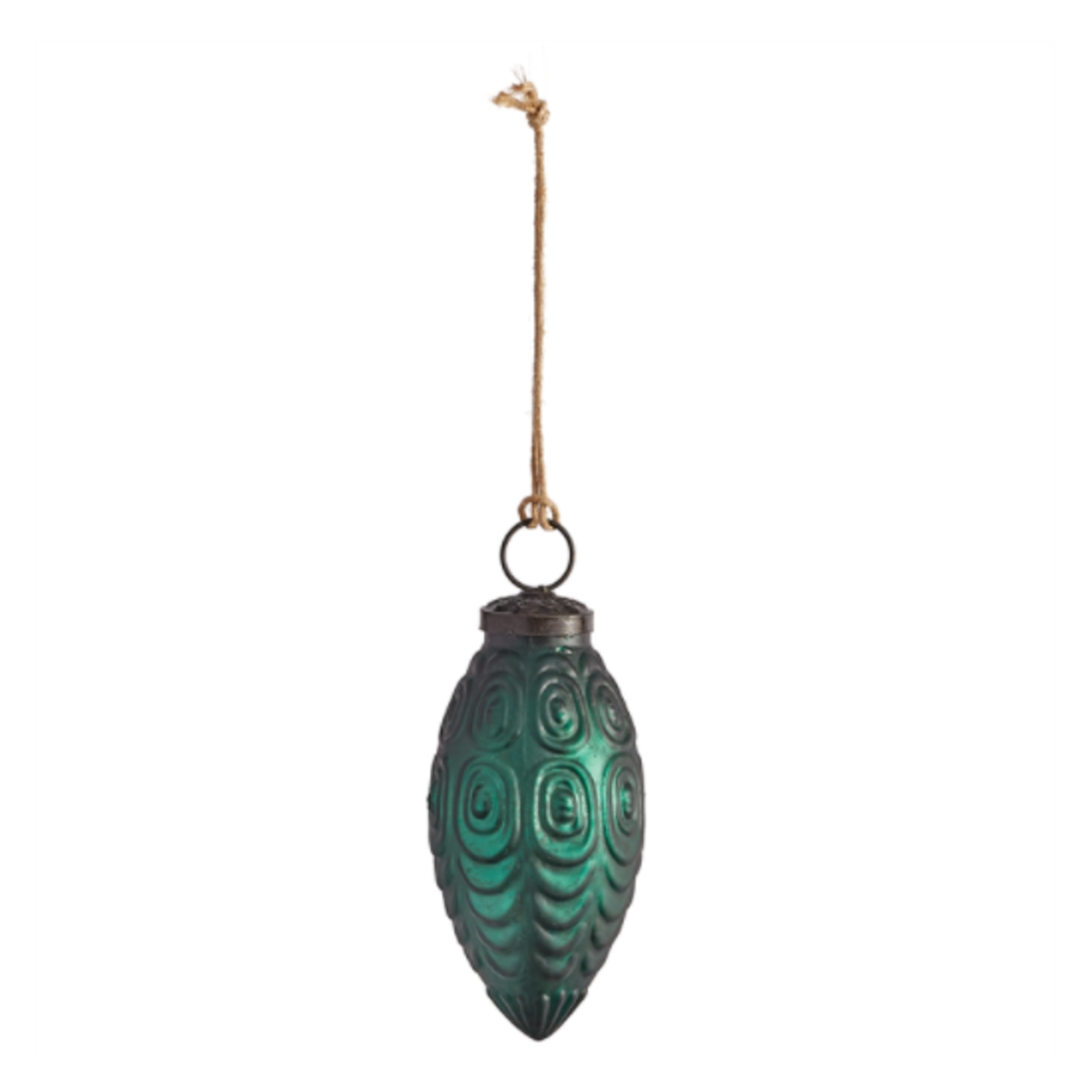 In a verdant tone and matte finish, this traditional ornament has earned a spot on the tree. The rusted metal accent & jute tie give it a casual look.